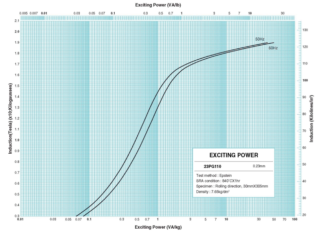 * Thickness: 0.23mm * Iron Loss W17/50 = 1.09 W/Kg W10/400 = 9.90 W/Kg